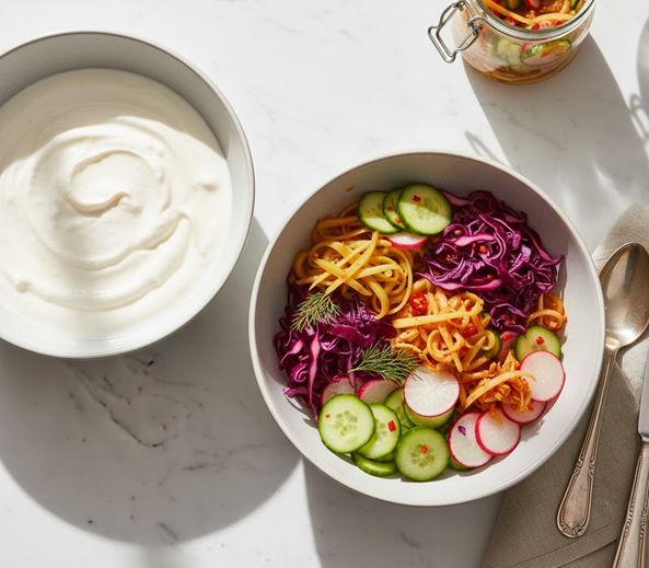 - Usar alimentos probióticos e prebióticos: probióticos (bactérias boas) e prebióticos (fibras que alimentam essas bactérias) equilibram a microbiota e melhoram digestão, imunidade e humor [3,4].