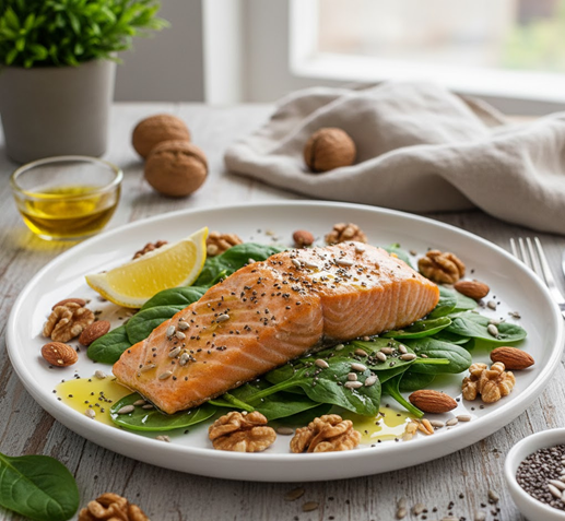 - Incluir gorduras saudáveis: peixes ricos em ómega‑3, nozes, azeite e sementes ajudam a reduzir inflamação e contribuem para a função cerebral [2].